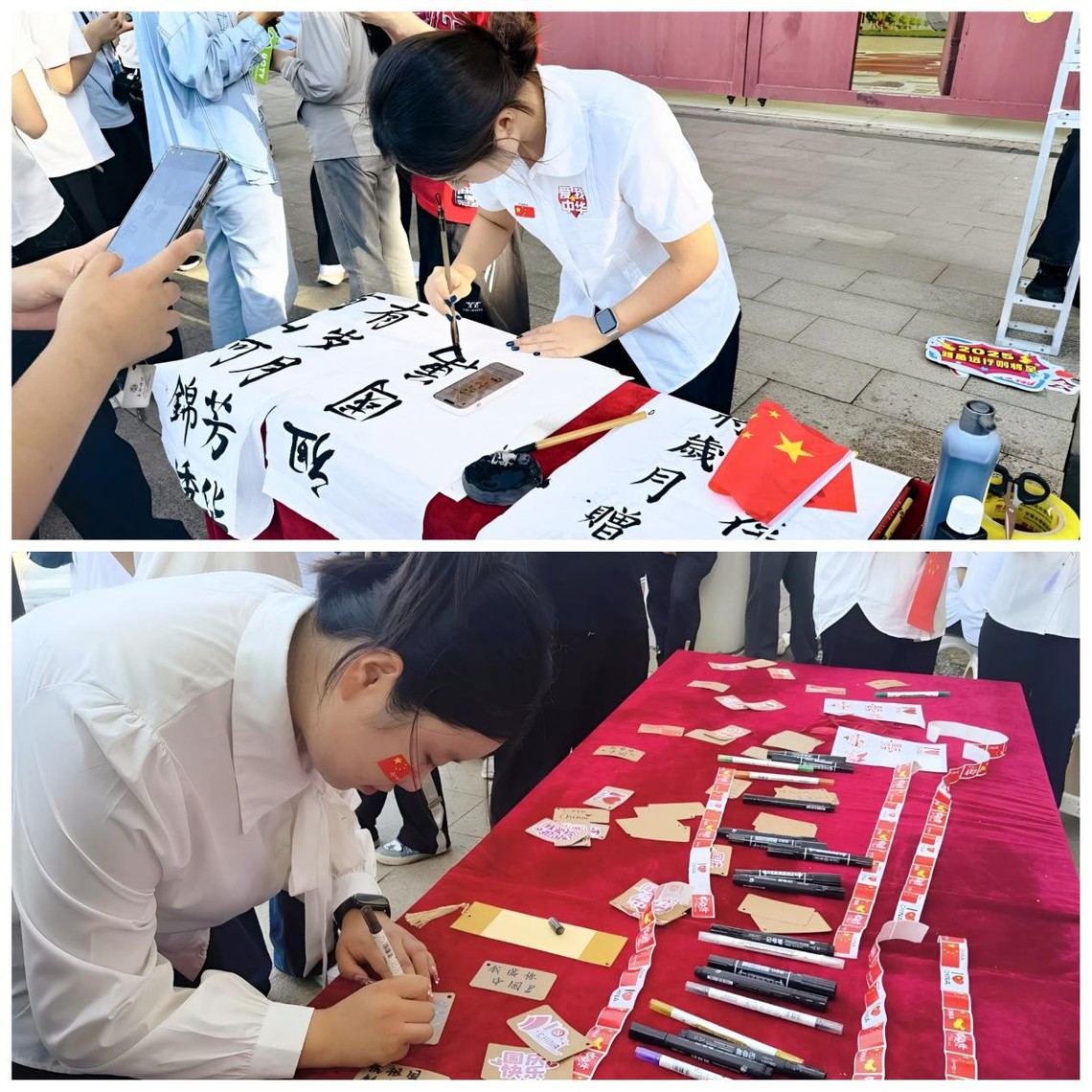 活动现场,素雅的空白画纸与书签整齐陈列,琳琅满目的国庆主题贴纸与彩绘工具点缀其间。大家俯身于案前,迅速沉浸到创作的世界中:有的同学小心翼翼地挑选天安门、华表、长城等象征国家形象的贴纸,精心构思布局;有的则执起画笔,在方寸书签上勾勒出蜿蜒的江河;更有不少同学提笔蘸墨,郑重写下“华夏长春”、“祖国万岁”、“此生无悔入华夏”等饱含深情的词句。
