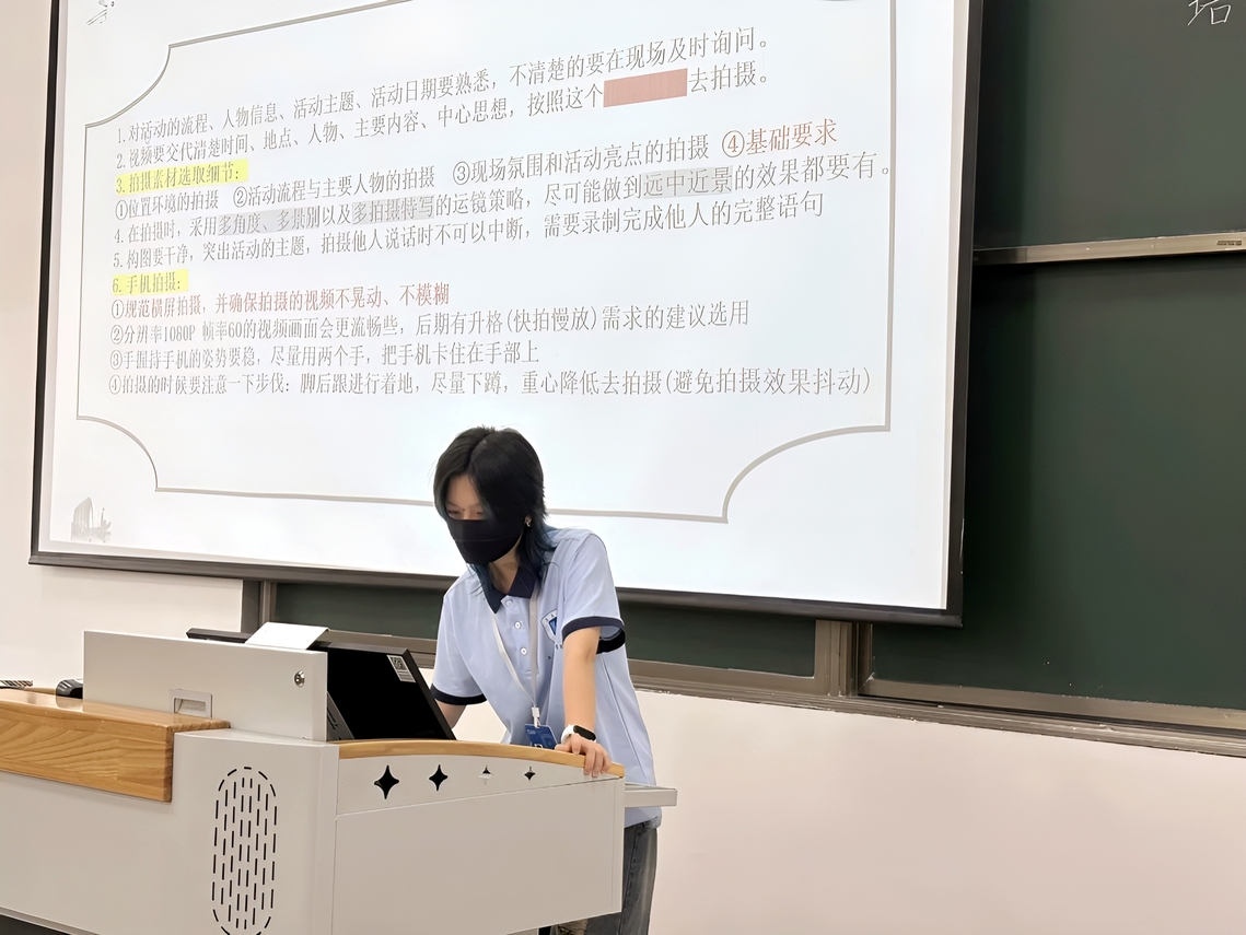 随后社长吴永豪开展了新闻采编专题培训,重点强调了新闻时效性、标题规范及稿件类型差异。她表示,新闻标题应采用“前缀+具体事件”的结构,正文首段需明确时间、地点、人物与活动目的,主体部分详述活动流程,结尾需体现活动反响与影响。稿件撰写需严格确保教师职称准确无误;使用人工智能辅助创作时,应提供详尽提示词,并通过人工校验确保语句通顺、逻辑严谨。发布前须完成审校流程,确保内容真实客观、语言流畅,图片与文本匹配且排版规范。
