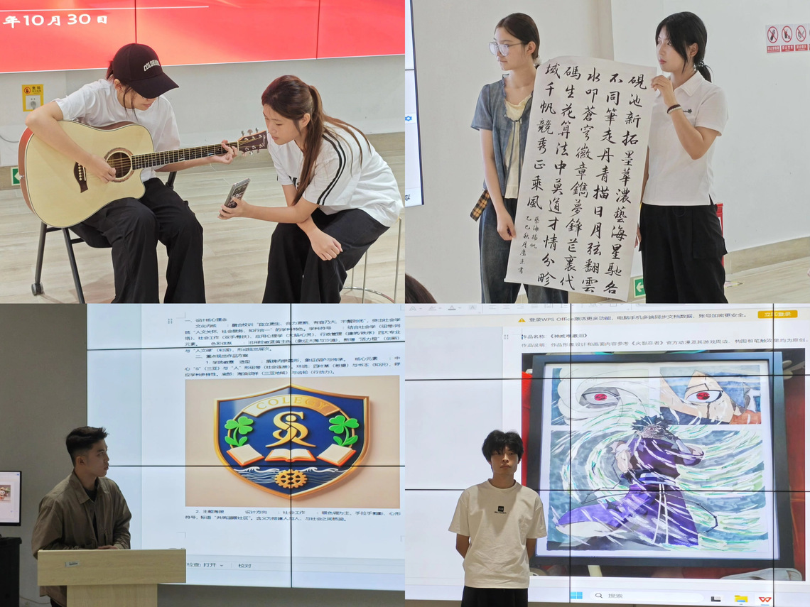 舞台之上,选手们都大放异彩,带来了一场精彩纷呈的视听盛宴。歌曲《原来你也在这里》,《泪桥》婉转抒情,选手用细腻嗓音打动全场;徽章设计选手的作品巧妙融入专业知识与地域文化元素,兼具美感与深度;毛笔字展示的选手则以书法形式呈现自创律诗,将对校园的感悟与专业特色融为一体,笔锋间尽显文化底蕴;绘画创作的选手展示了高中时期创作的优秀作品,不仅技法扎实,更有独特的艺术表达;古筝选手带来的弹奏作品指法流畅如行云流水,把古筝的古典韵味发挥到淋漓极致;吉他弹唱选手分享了因缓解学习压力结缘吉他的故事,现场弹唱真挚动人,引发台下共鸣;写作选手带来即兴创作的诗歌,字里行间满是对大学生活的热爱与浪漫遐想;摄影选手则通过一幅幅精心拍摄的作品,分享创作背后的故事与对生活的独特感知,展现出对摄影艺术的执着热爱。